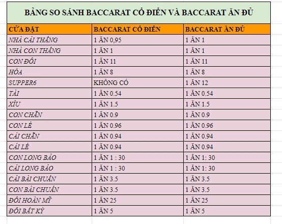 BẢNG SO SÁNH GIỐNG – KHÁC NHAU GIỮA BACCARAT CỔ ĐIỂN VÀ BACCARAT ĂN ĐỦ