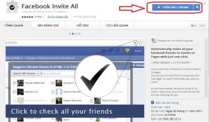 Tại đây, nếu bình thường thì chúng ta sẽ click mời từng bạn bè một, nhưng bây giờ đã có Facebook Invite All rồi, bạn chỉ cần nhấp vào biểu tượng của tiện ích (biểu tượng chữ v) để tiện ích Facebook Invite All tự động mời tất cả bạn bè của bạn like FanPage cho bạn.