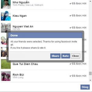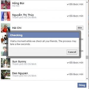 Qúa trình mời tự động diễn ra trong vài phút, thời gian dài hay ngắn tùy vào số bạn bè Facebook của bạn và sóng mạng nhà bạn. Khi đang tự động mời bạn bè sẽ hiện lên cửa sổ “Checking“. Khi đã mời xong, cửa sổ “Checking” sẽ chuyển thành cửa sổ “Done“. Bạn nhấn “Close” để đóng cửa sổ lại.