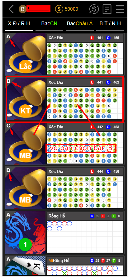 ♣ Bước 2: Có 4 bàn xóc đĩa là A B C D bạn chọn 1 trong 4 bàn để chơi