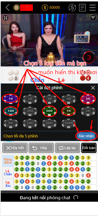 ♣ Bước 4: Nhấn chuột vào các ô có màu sáng để tắt tất cả các loại tiền. Sau đó nếu bạn chơi bé thì bạn chọn các loại tiền là 10,50,100,500,1k