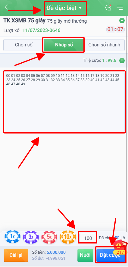 - CHỌN CƯỢC ĐẶC BIỆC 75 GIÂY VÀ CLICK NHẬP SỐ COPPY DÀN 50 SỐ RA