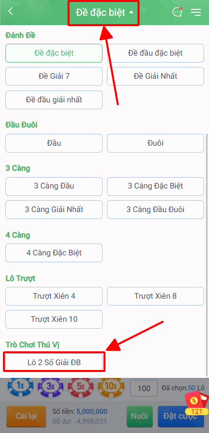 - BƯỚC 5 : SAU KHI ĐÃ NHẬP DÀN 50 SỐ VÀO RỒI THÌ CHỌN TIẾP ” GIẢI ĐẶC BIỆT ” + TRÒ CHƠI THÚ VỊ ” CHỌN ” ” LÔ 2 SỐ GIẢI ĐB