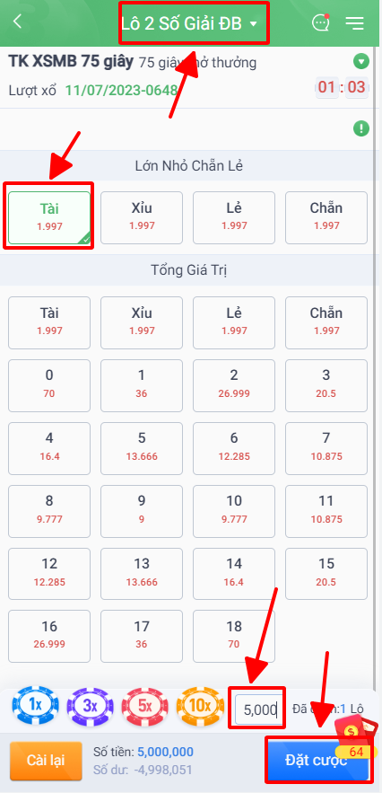 - CHỌN TÀI VÀ NHẬP SỐ ĐIỂM 5000Đ TƯƠNG ỨNG VS 5 TRIỆU