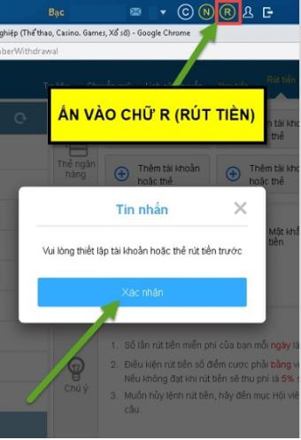 Bấm vào icon biểu tượng chữ “R” tại góc phải màn hình phía trên cùng. Hệ thống bật ra thông báo: Vui lòng thiết lập tài khoản hoặc thẻ rút tiền trước.