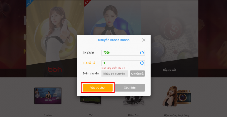 Tiếp theo chúng ta thao tác bước chuyển quỹ từ tài khoản chính sang tk KU Xổ Số và nhấp và nút “Vào trò chơi” để tiến hành tham gia trò chơi nhé!