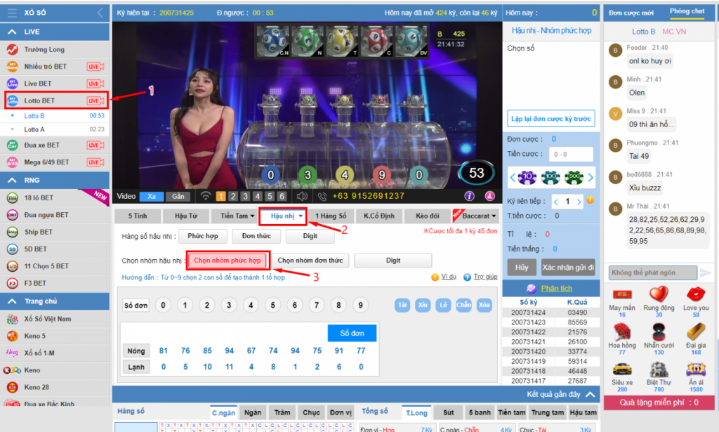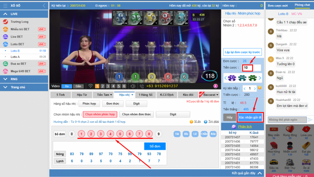 Tại giao diện KU Xổ Số có rất nhiều trò chơi khác nhau tuy nhiên trong bài này chúng ta đang tìm hiểu về Lottobet nên chúng ta hãy chọn mục lottobet để tìm hiểu nhé. Như hình thì chúng ta chọn mục Lottobet và tại đây có 2 sảnh A và B (sảnh A có MC người Trung Quốc và sảnh B có MC người Việt còn lại cách thức chơi hoàn toàn giống nhau). Khi đã chọn sảnh các bạn hãy nhìn vào các cửa đặt và chọn cửa cược HẬU NHỊ nhé và chọn NHÓM PHỨC HỢP như hình minh họa các bạn hãy xem kỹ nhé!