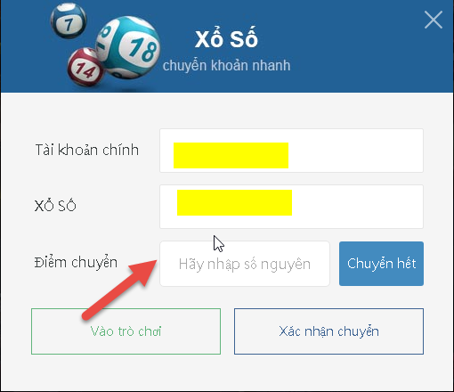Bạn hãy nhập số điểm muốn chuyển vào Xổ số và bấm Xác nhận chuyển. Trong trường hợp các bạn muốn tham khảo trước thì bấm Vào trò chơi là được.