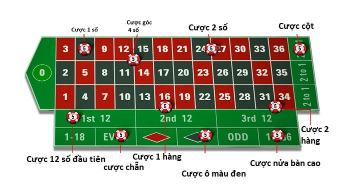 Sau đây chúng ta sẽ vào chi tiết giải thích các loại cược (bạn có thể kết hợp với hình bàn cược ở bên trên để có thể hiểu rỏ hơn)