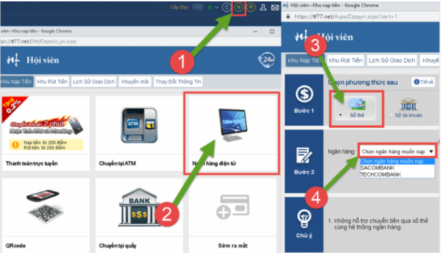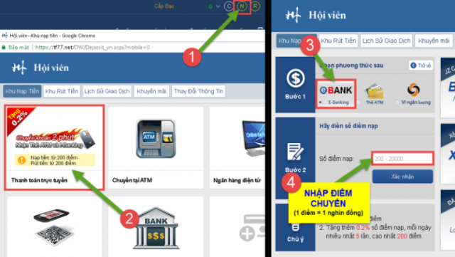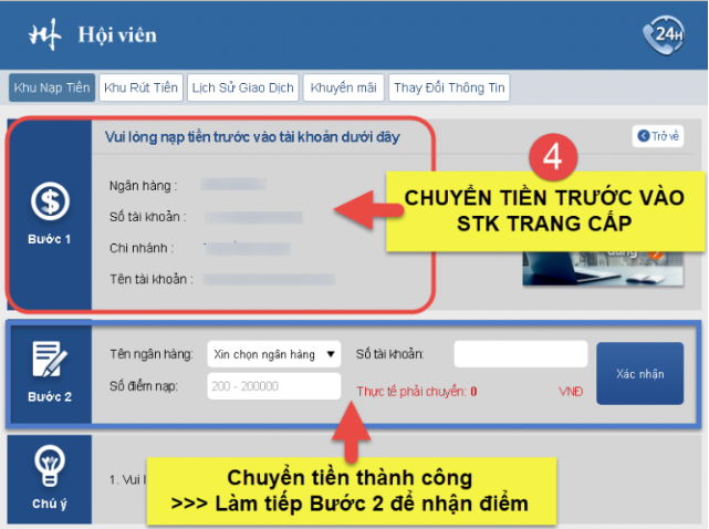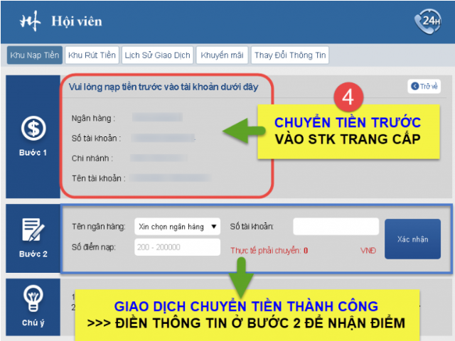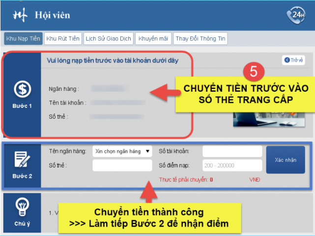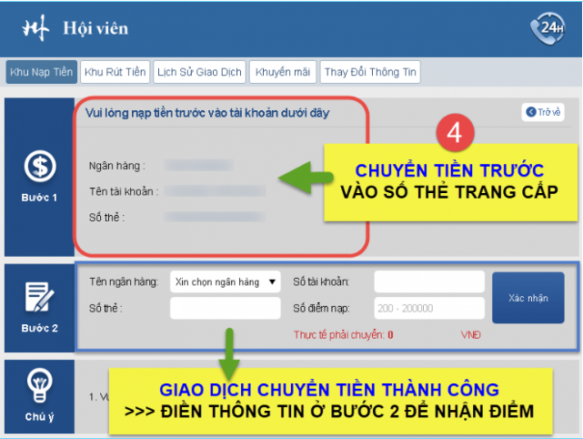 Các bạn chuyển tiền theo số thẻ trang cung cấp và cũng làm lệnh nhận điểm như bình thường.