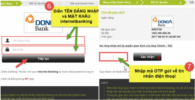 Các bạn nhập thông tin tài khoản internet banking của mình để tiến hành thanh toán. Hệ thống sẽ gửi mã OTP về điện thoại các bạn để xác nhận. Nhập mã OTP là hoàn tất quá trình nạp tiền.
