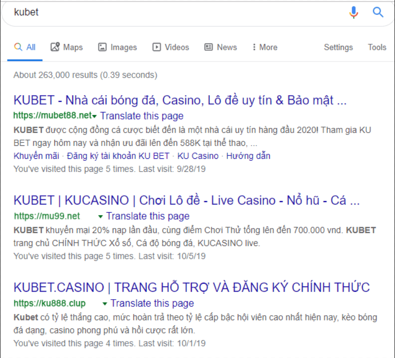 Tò mò vào tìm thử Kubet trên google search thì ngay lập tức có khoảng 263.000 kết quả trả về.