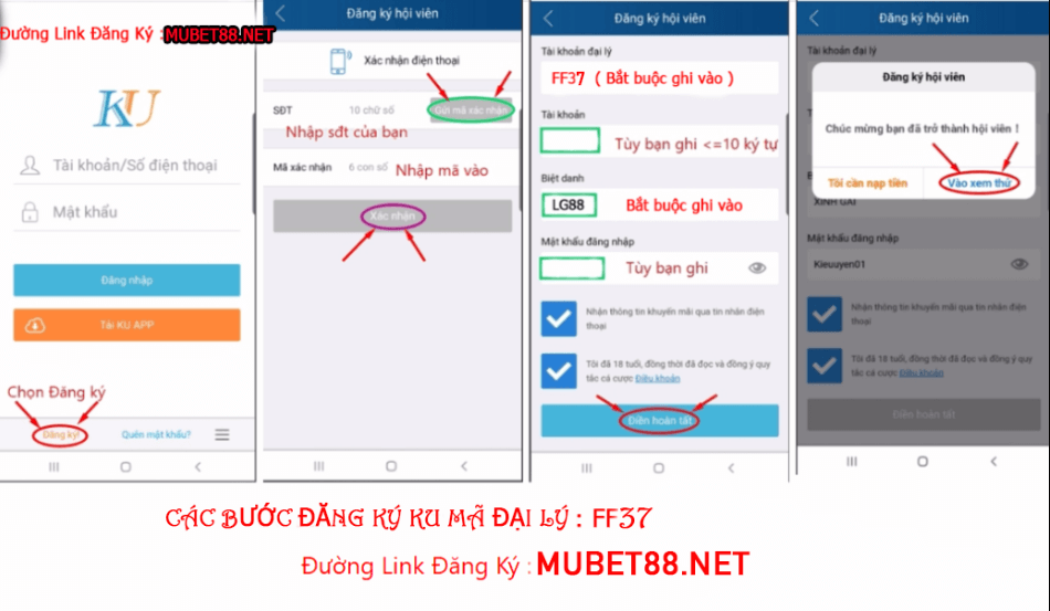 Điền đầy đủ thông tin của mình vào. Lưu ý sau khi điền số điện thoại, anh chị nhấn chọn Gửi mã xác nhận để chờ mã xác nhận từ MUBET( KU CASINO ) gửi sang cho anh em để xác minh số điện thoại