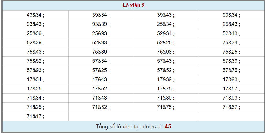 BẢNG DÀN XIÊN 45 CẶP XIÊN
