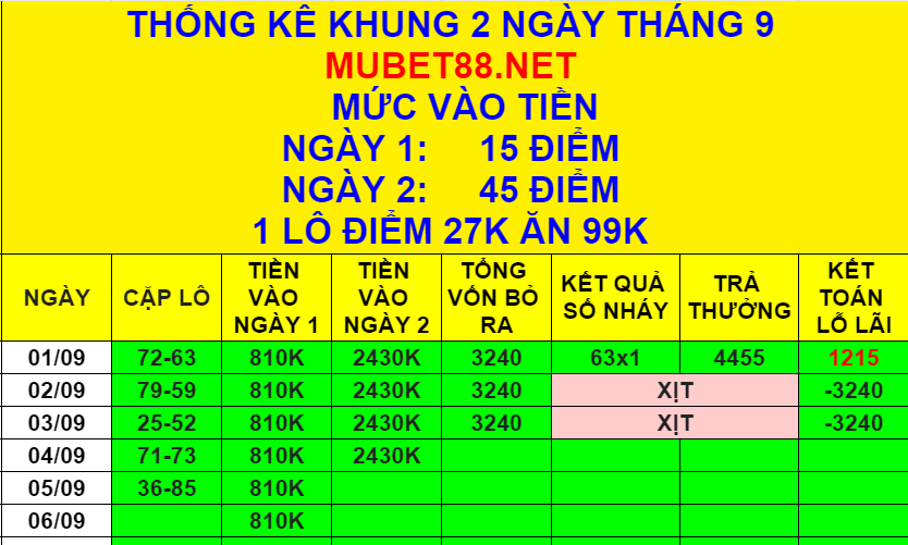 dưới đây là bảng thống kê lô khung và các vào tiền hợp lý cho song thủ lô khung 2 ngày của MUBET – BET9