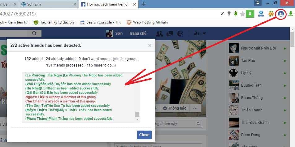Đăng nhập vào nhóm facebook mà bạn muốn thêm bạn bè vào, nhấp vào biểu tượng của Group Invite All trên thanh tiện ích của trình duyệt rồi nó sẽ tự động mời từng bạn bè một vào nhóm một cách nhanh chóng. Khi mời hết bạn nhấn “Close” để kết thúc.