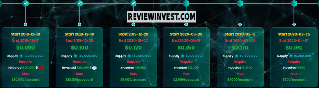 - Giai đoạn 2: Giá 0.1$. Tổng bán: 120,000,000. Từ 19/12/2019 đến 26/12/2019 (Đã kết thúc)