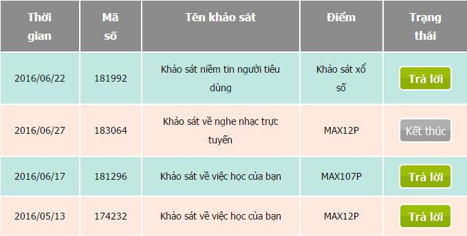 • Khảo sát công khai: Dạng khảo sát này điểm ít hơn khảo sát riêng, mỗi khảo sát từ 1 đến 20 câu hỏi, khi hoàn thành bạn sẽ nhận được 1 đến 20 điểm,tương ứng 100vnđ – 2000vnđ câu hỏi khảo sát cũng ít hơn.
