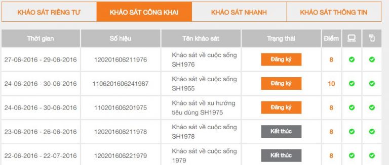 • Khảo sát riêng tư: Mỗi khảo sát từ 30 đến 40 câu hỏi, khi hoàn thành bạn sẽ nhận được 100 đến 500 điểm, tương ứng 10.000vnđ – 50.000vnđ.
